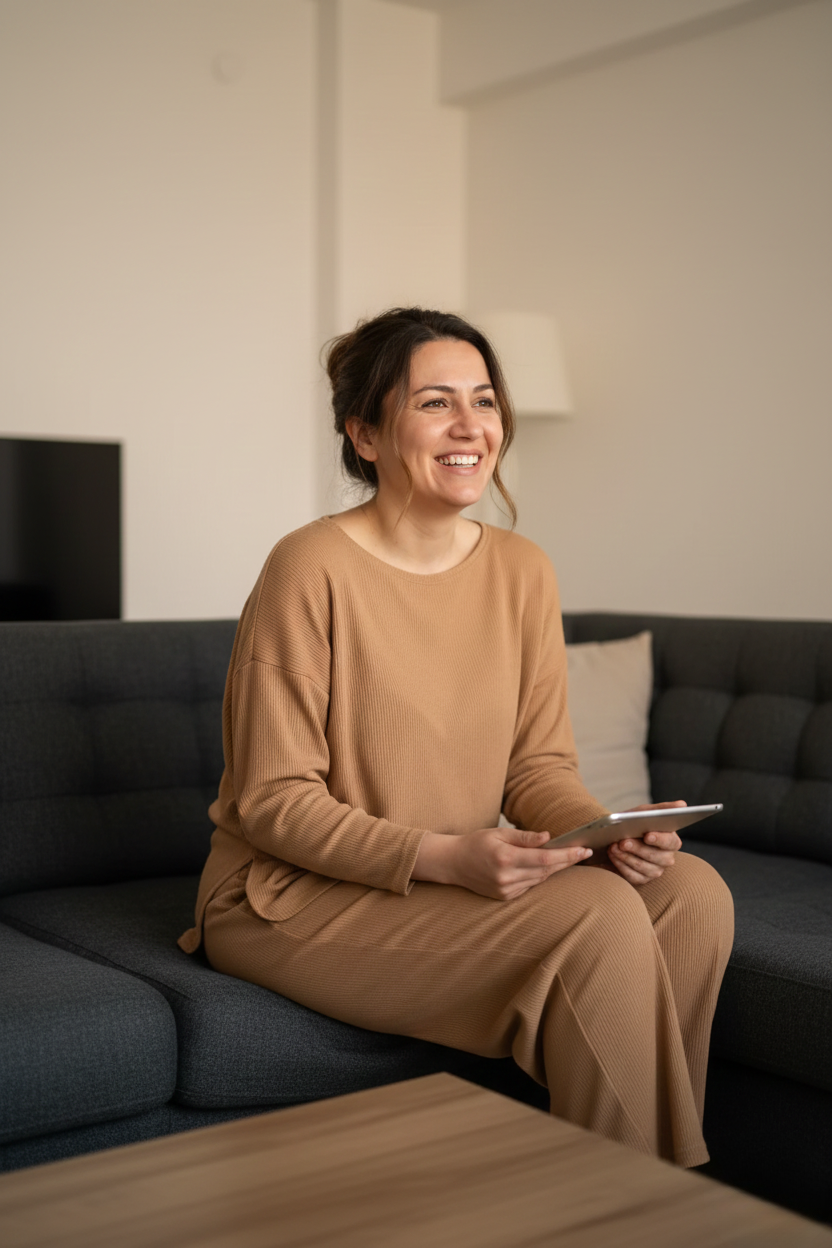 Ev içinde hem şık hem de özgürce hareket etmenizi sağlayan kesimle şıklığı ev konforuna taşıyın.